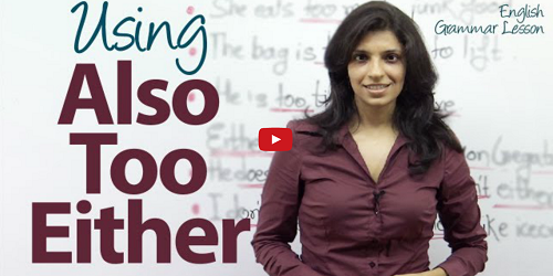 In This Tutorial You Will Learn How To USE 'Also' , 'Too' & 'Either' correctly in a sentence - English Grammar & Vocabulary Lesson.